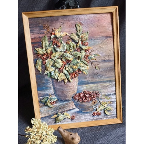 картина малинка, скульптурная живопись, объёмная живопись, фактурная картина, натюрморт, осенняя картина, картина в подарок, авторская картина Логиновой Татьяны, синяя картина
